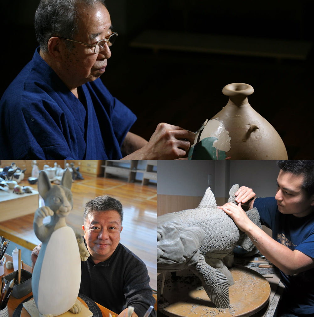 『陶という素材には人の作った造形の作為的な部分を和らげ、人工物である作品を自然物の様な状態にする特徴があります。このことが作為的になりがちな私の造形に作品としての深みを与えてくれます。』と完眞さん。モチーフの持つ雰囲気を自然な風合いの陶で表現、リアルな表情の作品は祖父・父から受け継がれた情熱と完眞さんの世界が融合している。